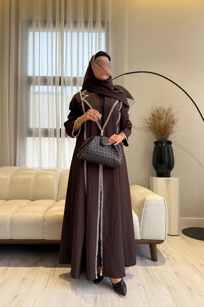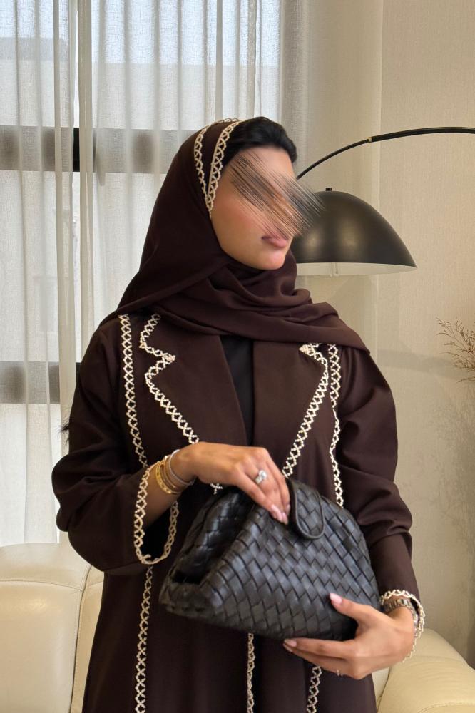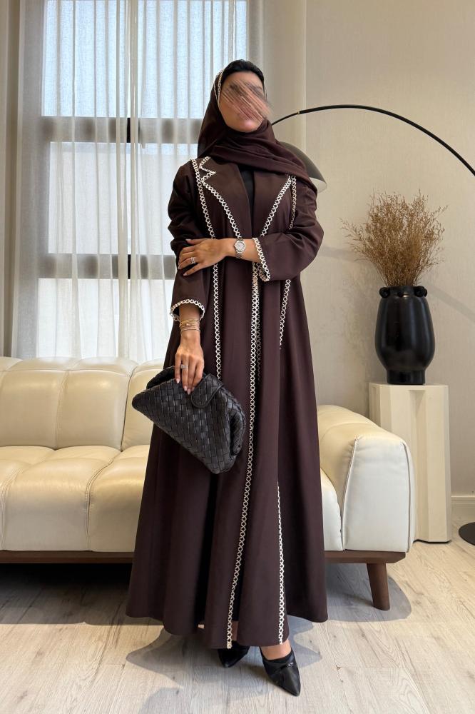 عباية كريب باللون البني مزين بشريط باللون البيج + طرحه بني باللون البيج