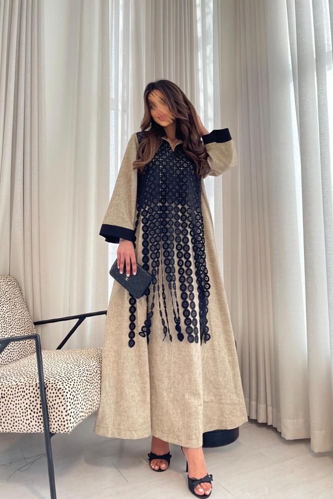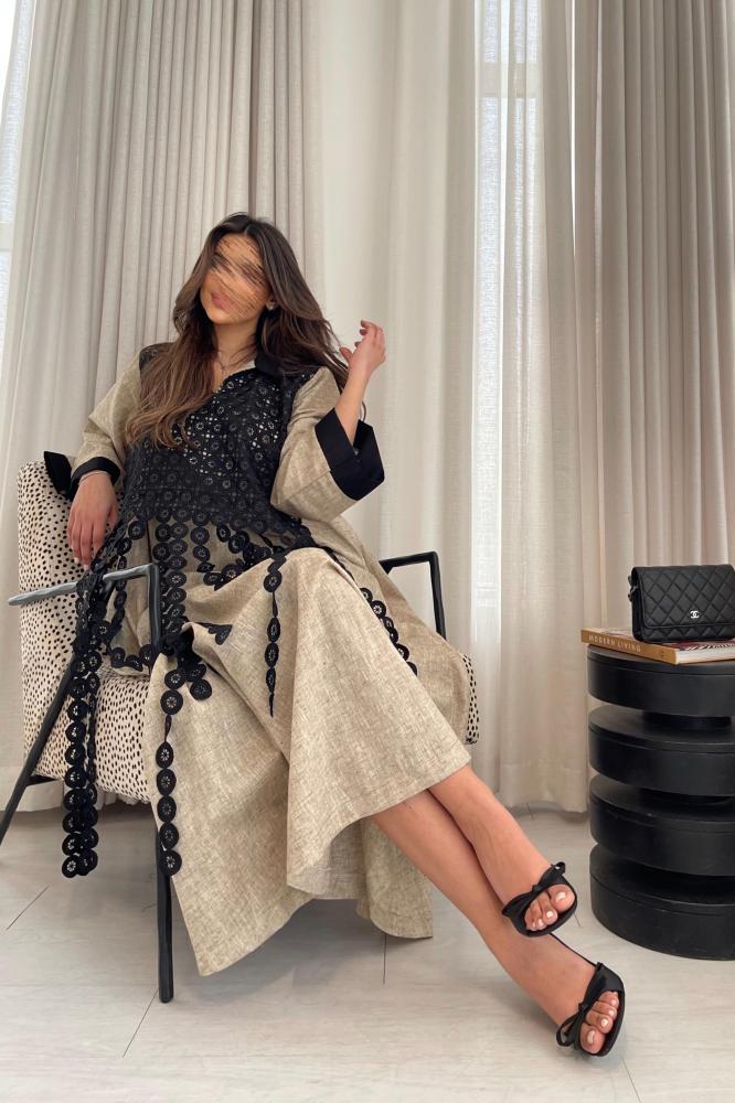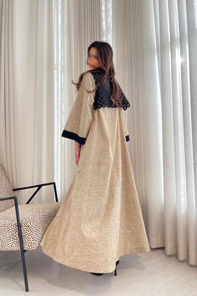 جلابيه لنن بيج مزينه على الصدر والخلف بقماش جبير اسود