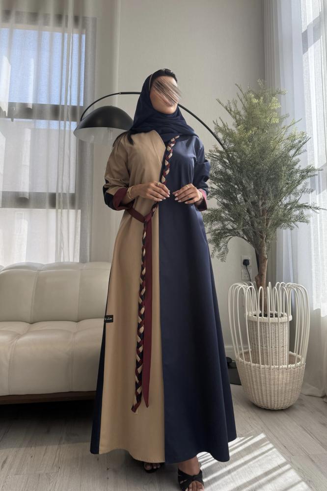عباية كتان باللون الكحلي والبيج والعنابي القصه نص كلوش+ طرحه كحلي بطرف بيج